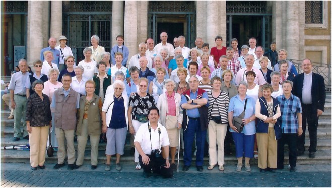 ![]() Groepsfoto voor de "Santa Maria Maggiore" te Rome Zet de muisaanwijzer op het hoofd om de naam te zien. |